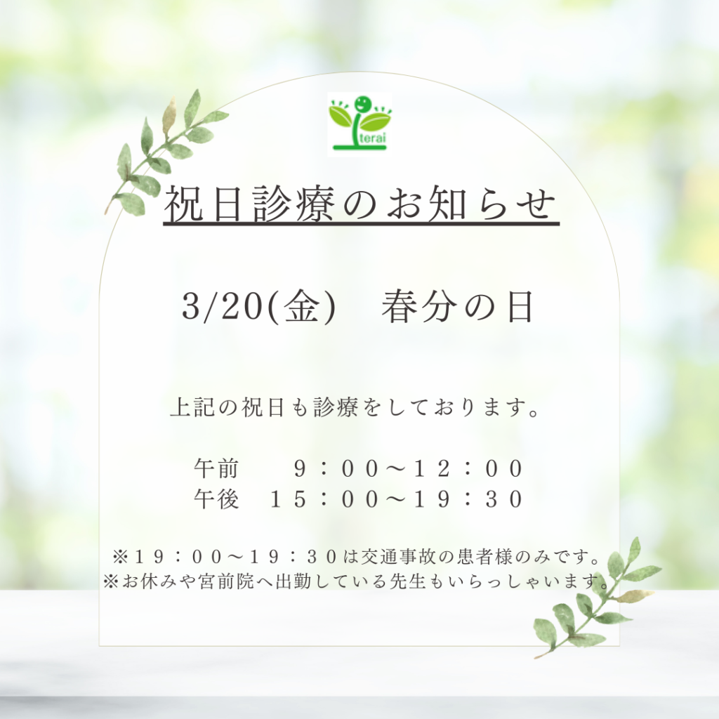 「休日にしっかり体を整えて、新年度を最高のコンディションで迎えたい」という方は、ぜひ3月20日の祝日診療をご利用ください。