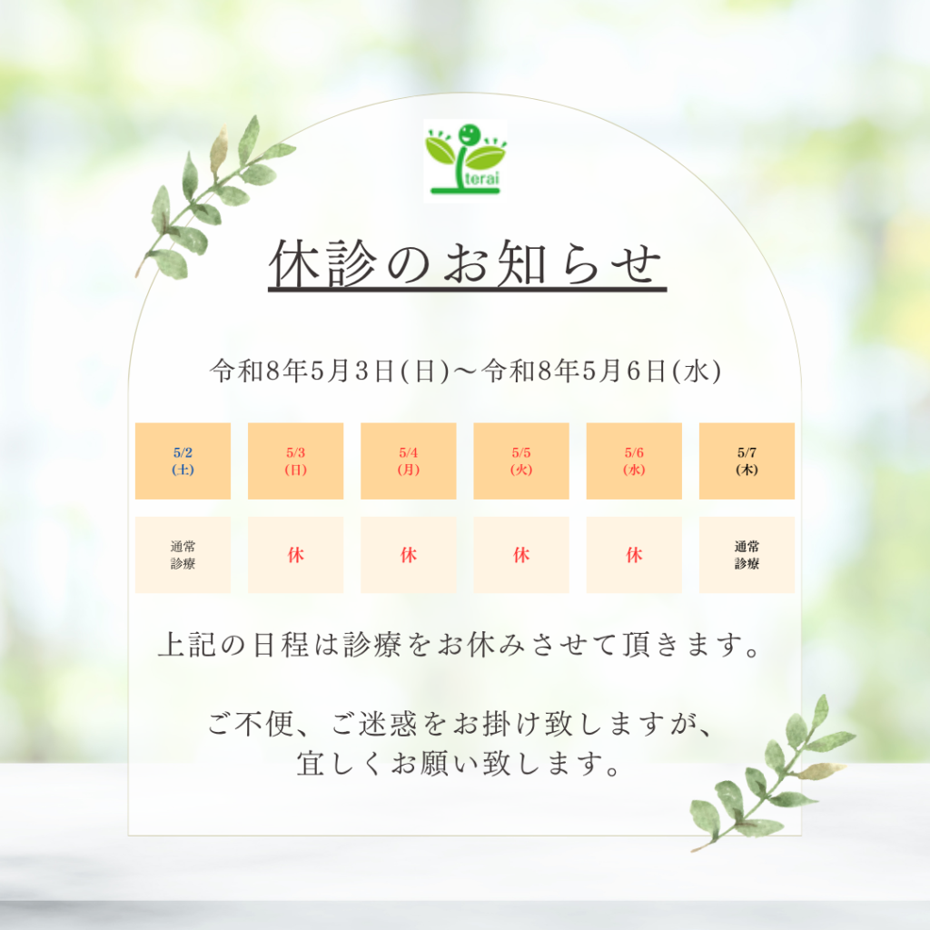 もし連休中に体に違和感を覚えた際は、無理をせず安静を心がけてください。5月7日より、皆様の元気な毎日を全力でサポートさせていただきます。